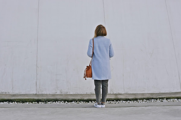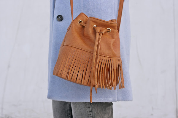 Seguimos con este outfit cómodo de invierno y le añadimos la prenda exterior, un abrigo lanero con solapas de corte retro en azul bebé. Y mi bolso favorito, esta preciosa bombonera de flecos en tono camel que no suelto.