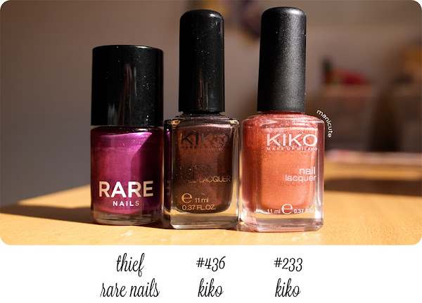 Como veis, los esmaltes empleados son low cost :D Creo que el único que podréis encontrar sin problema es el de RARE, puesto que el#436 de KIKO pertenece a la edición limitada Laser, y el #233 tiene muchos años (fue uno de los primeros esmaltes que compré de la marca, con eso lo digo todo...)