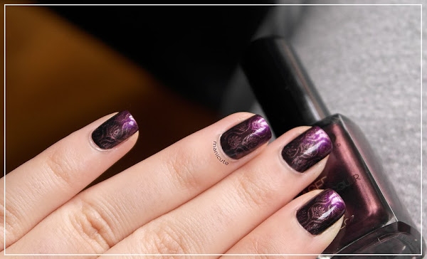 Con esta manicura, he querido tomar los conceptos de colores oscuros, pero con personalidad, propios del Barroco. Los tonos metálicos (el cobre de la estampación), y los diseños con filigranas. Pero, como bien sabéis, me gustan las manicuras sencillas; por supuesto, que llamen la atención, pero no por su exceso, sino por su elegancia. Espero haberlo conseguido con este nail art.