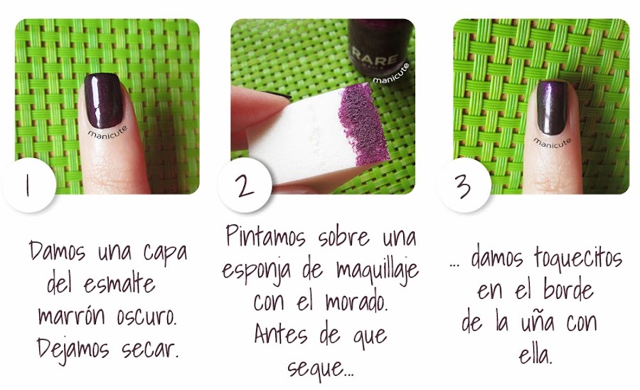 (2) Damos una capa del esmalte morado en una esponjita de maquillaje. Dejamos que se absorba un poquito el pintaúñas (unos 10 ó 15 segundos)