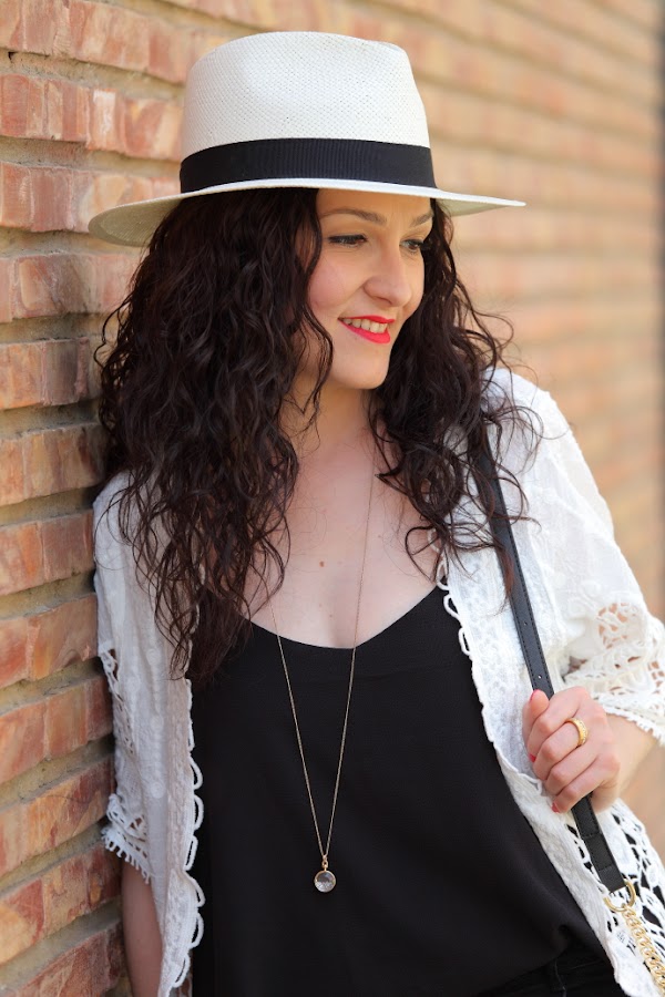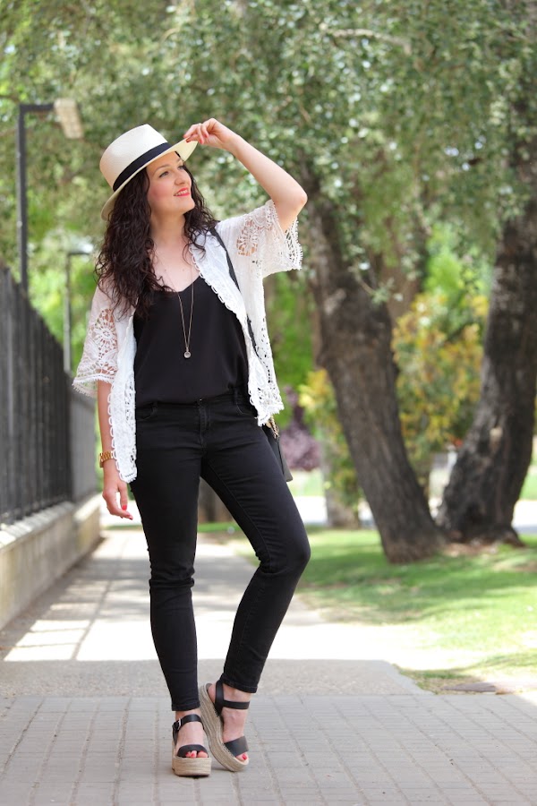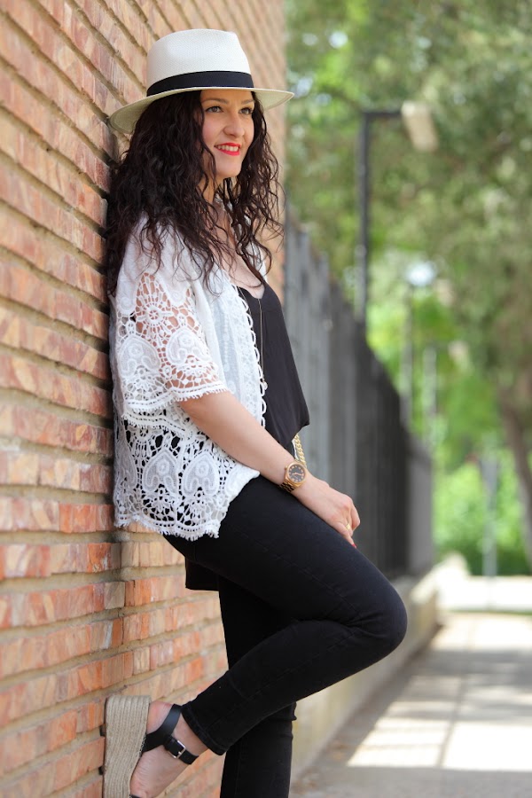 Empezando la semana con un outfit en blanco y negro, uno de mis combos favoritos. Un estilismo sencillo con top de tirantes y jeans negros al que le he combinado una chaquetilla blanca que se lleva todo el protagonismo. Y no es para menos, combina tela y guipur obteniendo una prenda muy bonita e ideal para el verano, que además se puede adaptar a diferentes looks.
