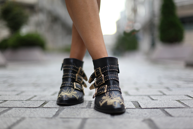 Los botines le dan el puntazo a un look que se firma con unas gafas de sol estilo Aviador.
