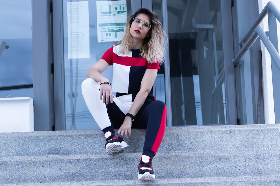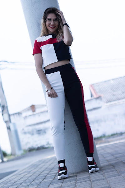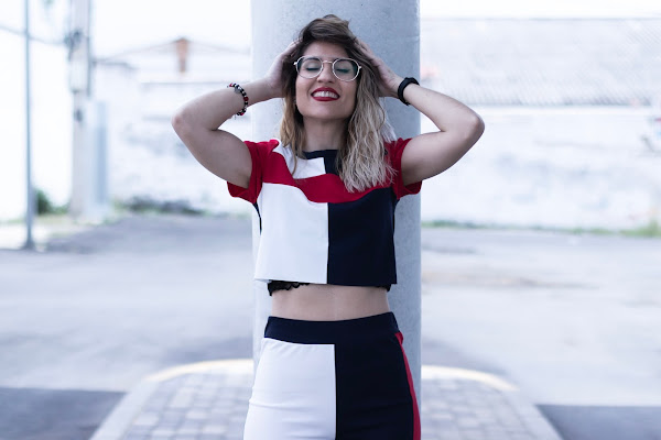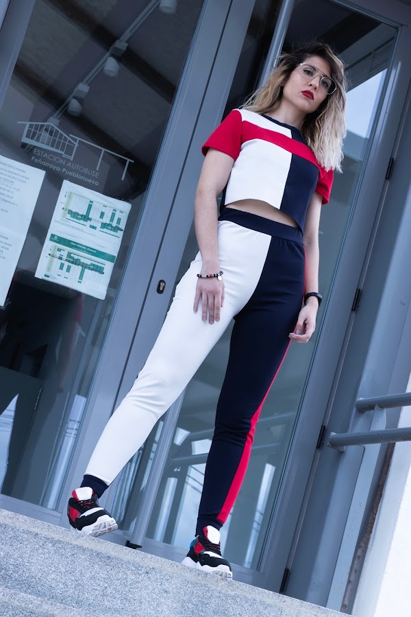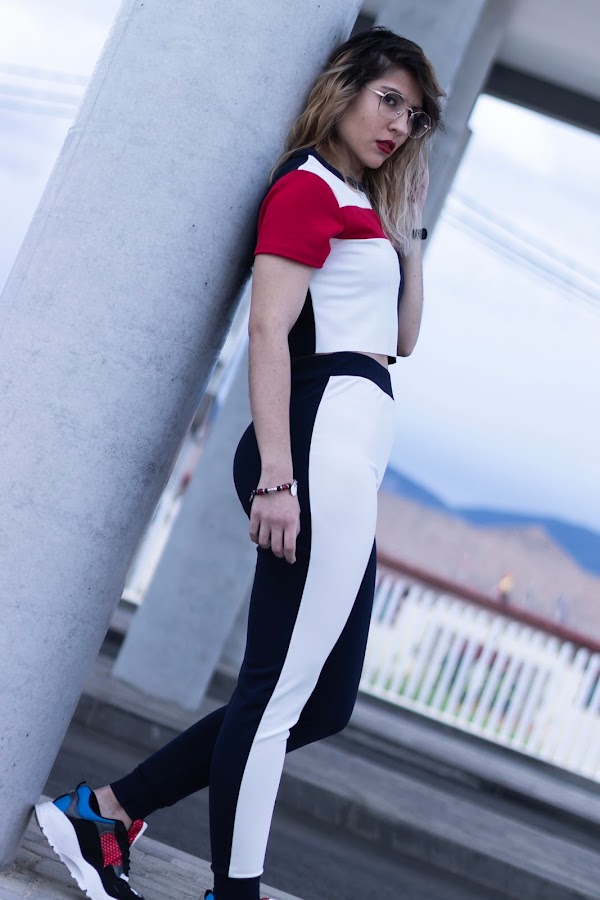 Hoy os traigo otro de mis conjuntos sport, esta vez en varios tonos, mitad blanco, mitad azul marino y con unas rayas rojas, una en un lateral del pantalón y otra en el pecho y mangas del top. El top es crop y de manga corta. Me encanta la tela, me encanta el tacto y me encanta absolutamente todo de este conjunto.
