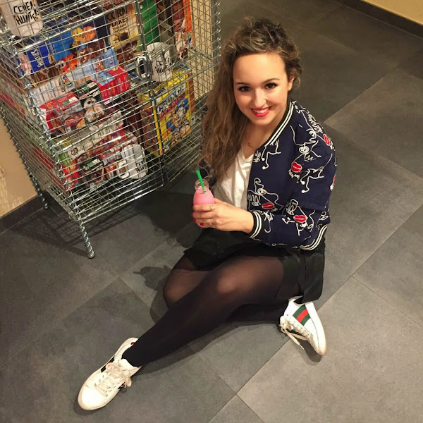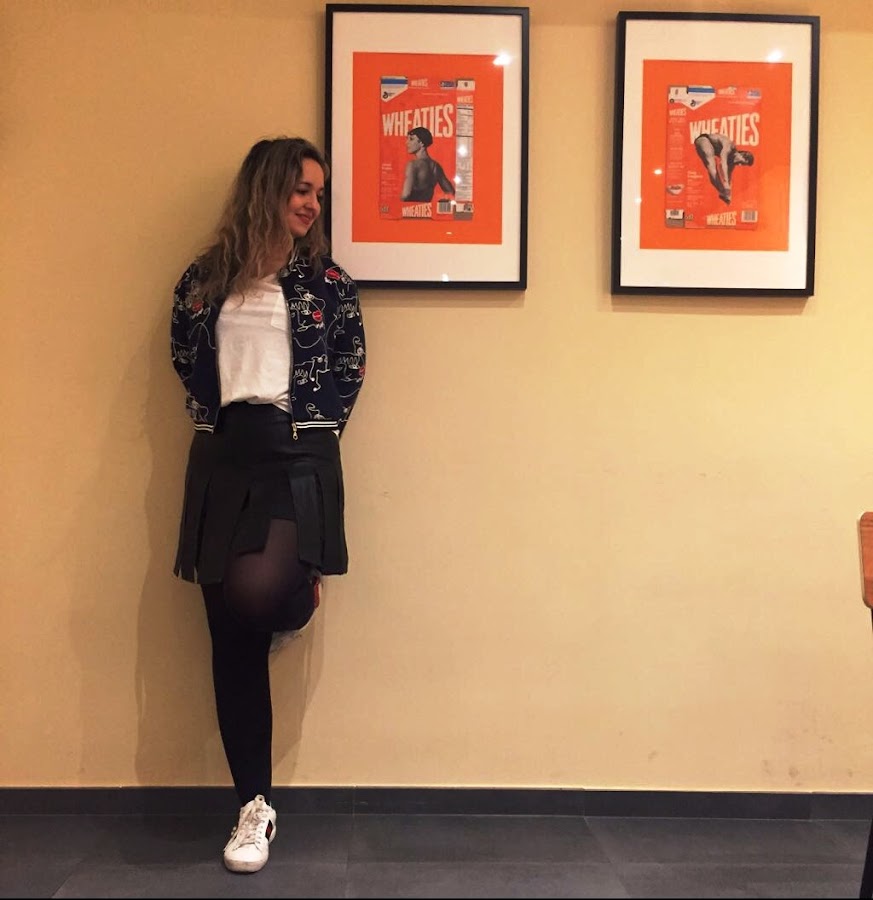 Os enseño el look que llevé en el que destaca esta preciosa cazadora azul de Vipshop. ¡Me enamoré de ella desde el minuto uno! Abulta poco, es muy calentita y tiene un diseño genial bordado en blanco y rojo. Yo la he combinado con una falda de tablas de piel, una camiseta básica blanca y mis deportivas de Gucci.