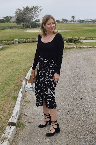 Para el resto de prendas, sin complicaciones, body negro de canalé (me parecen tan cómodos que va a ser mi prenda estrella durante todo el invierno), chaqueta para los ratos sin sol, zapato de tacón anudado (me encantan, espero que les quede mucha vida por delante...) y bolsito para guardar lo justo sin romperme el hombro...:(