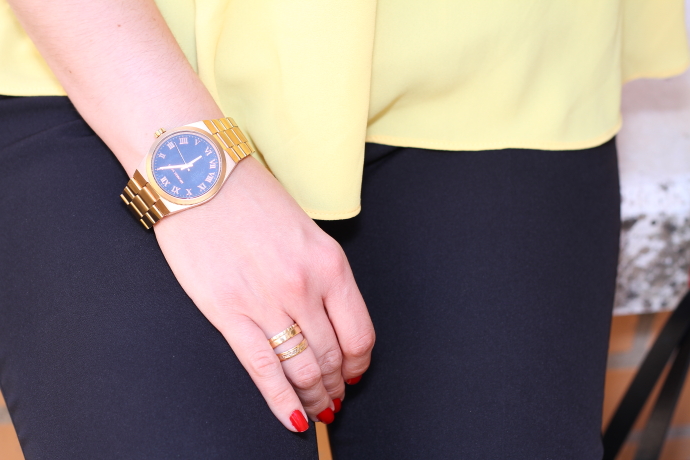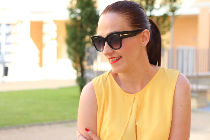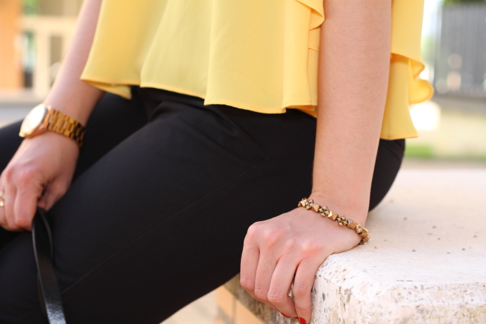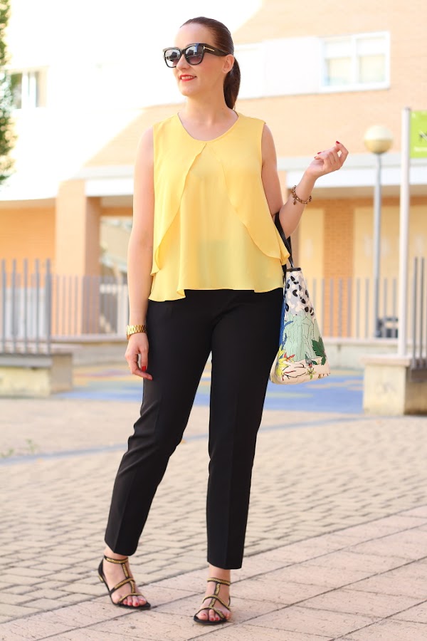 Muchos ya sabéis que la semana pasada empezaron las fiesta de mi pueblo. Aunque en un principio mi intención era la de seguir en el blog con el mismo ritmo de publicaciones, la realidad fue que finalmente opté por desconectar olvidándome casi por completo del mundo 2.0 y me dediqué plenamente a disfrutar de las fiestas en compañía de amigos y familiares. Pero una vez terminadas las fiestas aquí estoy de nuevo con este look que combina mis dos colores favoritos. Llevo un estilismo muy sencillo con una blusa vaporosa de volantes amarilla y pantalones capri negros. Para el bolso me he decantado por uno de mis favoritos, es increíble lo que anima este bolso los looks, y en los pies unas sandalias que me encantan por el detalle tan chic de las cadenas doradas.