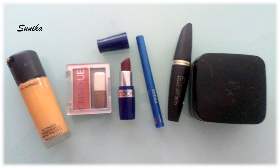 Como base de maquillaje usé la Master Foundation SPF15 de MAC y para matificar los polvos traslúcidos de Lancome. Para los ojos utilicé las 4 sombras marcadas en la foto, un azul por todo el parpado móvil, una morada en la zona de la banana y una azul oscura en la V para dar profundidad, bajo la ceja apliqué la sombra de tono natural.