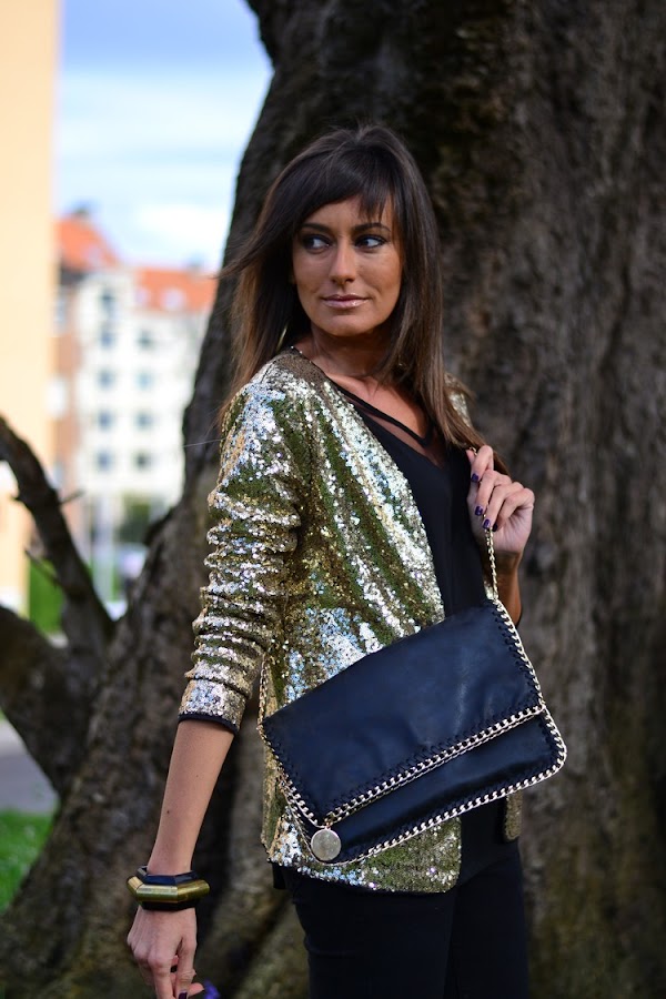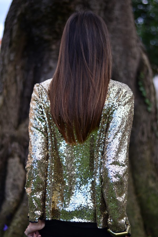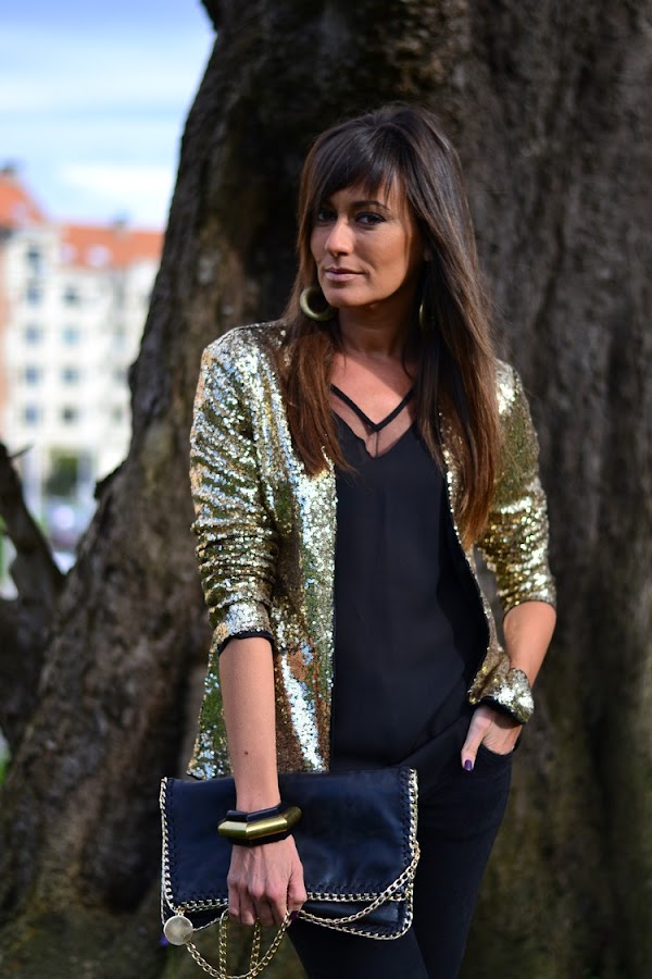 Hoy termino la semana con un look de esos de fin de semana del tipo de los que suelo llevar para una noche de viernes con amigas en la que salimos a cenar y a tomar algo después en el que la protagonista indiscutible es esta chaqueta de lentejuelas de Romwe que seguro os sonará porque aunque es nueva, sí que tengo un modelo muy similar de la temporada anterior y otro de hace dos en plateado; todos de corte distinto, pero con el denominador común del tejido de paillettes con brillos para brillar en las noches más especiales.