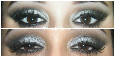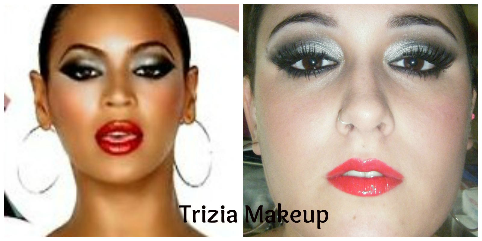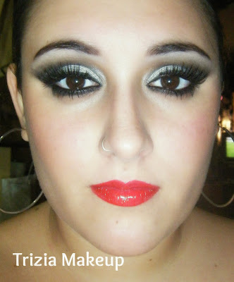 Es un maquillaje bastante potente, con los ojos en tonos plata y negro bastante marcados y unos labios rojos.