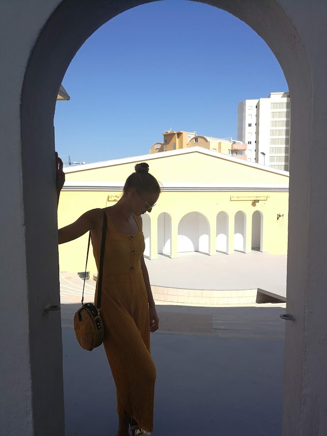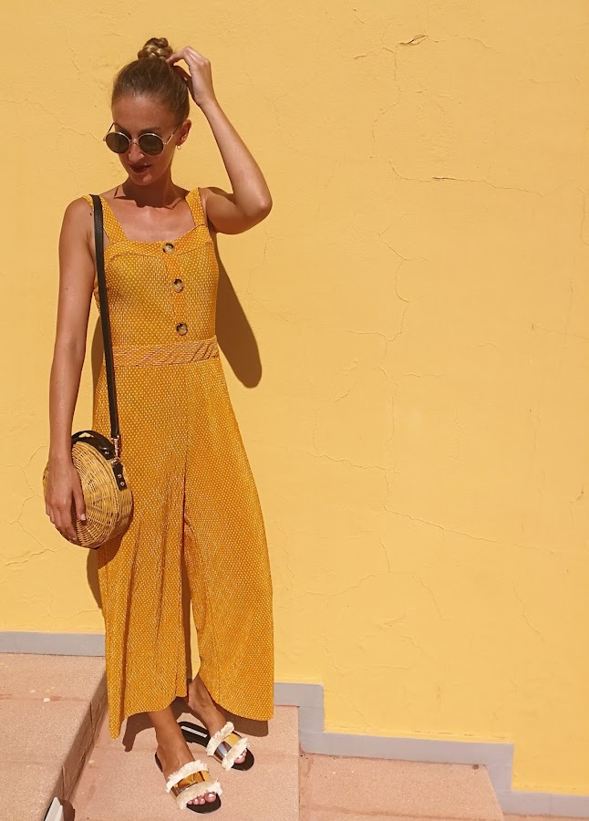 Para la visita elegí un look en amarillo que tanto se lleva este verano con un mono supercómodo de Mango y otro must de esta temporada el bolso redondo de mimbre.