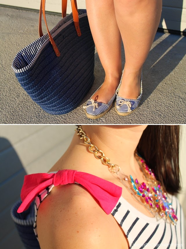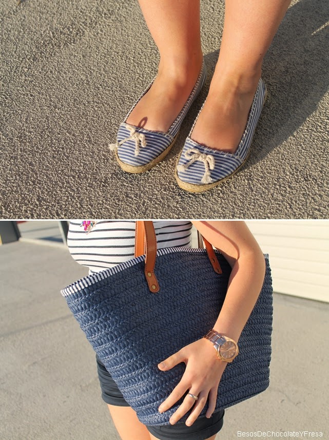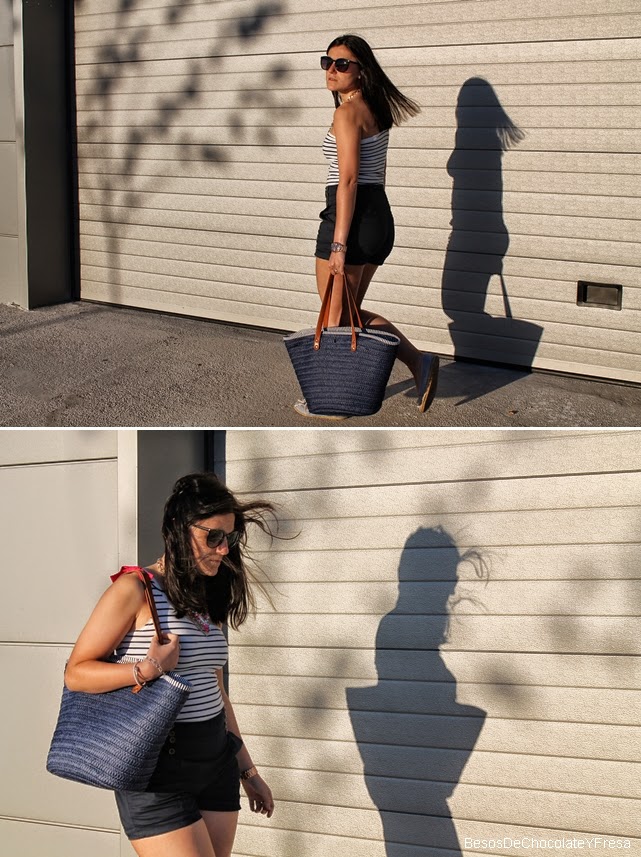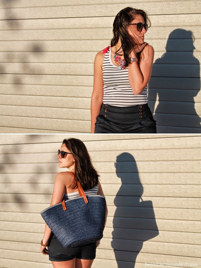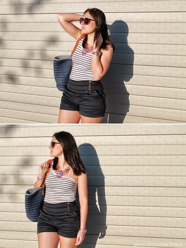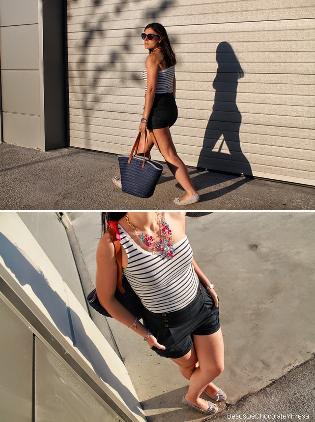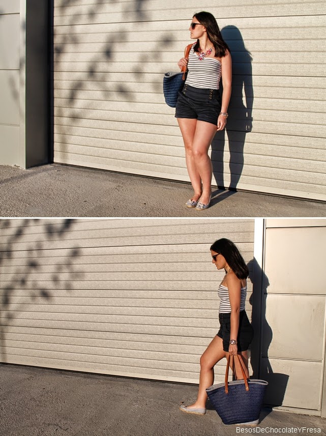 Estes shorts de talle alto y esta camiseta navy de un solo tirante con lazo rosa ya os la enseñe en dos post diferentes (aquí) y (aquí) y por eso ahora decidí juntarlas y acompañarlas con las espadrilles también a rayas marineras y mi nuevo capazo azul, apto para ir a la playa o piscina como para dar un paseo. Y como no, para darle un toque chic collar joya en azul y rosa.