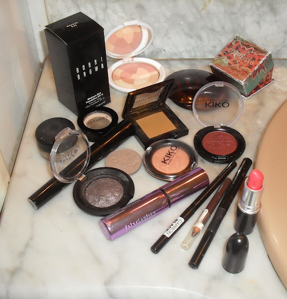 En los ojos llevo el paintpot Painterly de Mac, he marcado la cuenca con la sombra 122 de Kiko, la sombra 139 que es el tono melocotón lo he puesto en el párpado móvil, la sombra 136 (de las antiguas) en el último tercio y lo he subido un poco hacia la banana, he intensificado con la sombra 32 de la línea "Colour Sphere" he delinado con el eye liner negro de Kiko, en el párpado inferior he puesto el lápiz marrón de H&M y lo he difuminado con la sombra 32 de Kiko, en la waterline llevo el lápiz negro de Prestige, la máscara negra Ultratech de Kiko + el top coat longitud. El labial Costa Chic de Mac.