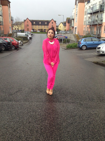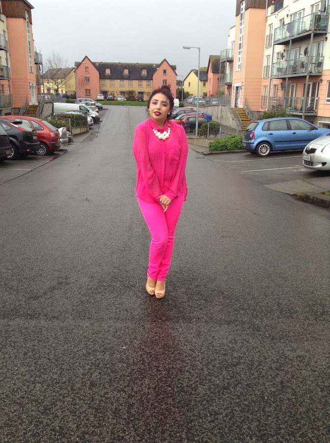 Ahora hablare un poco de mi outfit lo elegí en rosa neón ya que a mí en lo personal son fan del color rosa y los neones han marcado muy fuerte esta temporada pasada y aunque ahora viene la época de los colores pastel, aun se dejara ver los colores vibrante y neones. Como el que luzco yo. Finalmente las fotos han sido tomadas en un día de mucha lluvia ya que aquí por Irlanda hace un frio q extrémese pero aun así no quise dejar pasar la oportunidad de que me conozcan.