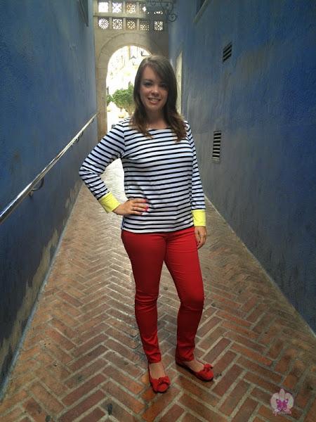 En esta ocasión combiné la camiseta marinera con pantalones y manoletinas rojas y me gustó mucho el resultado, pero ya me la he puesto también con vaqueros azules oscuros y con pantalones negros y queda fenomenal, así que iré probando nuevos outfits con ella ya que la veo perfecta para entre-tiempo, así que para la primavera va estupendamente.