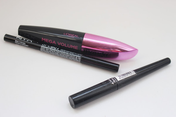 Para la línea de agua utilicé un lápiz de NYX, para el delineado el eye-liner de deliplus y para las pestañas la máscara mega volume miss manga de Loreal.