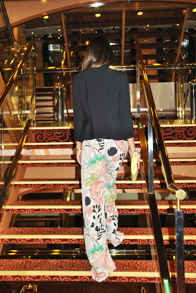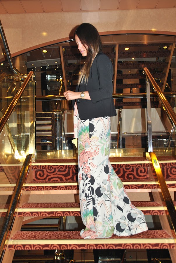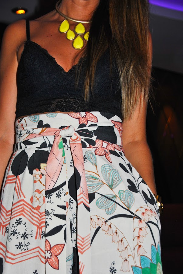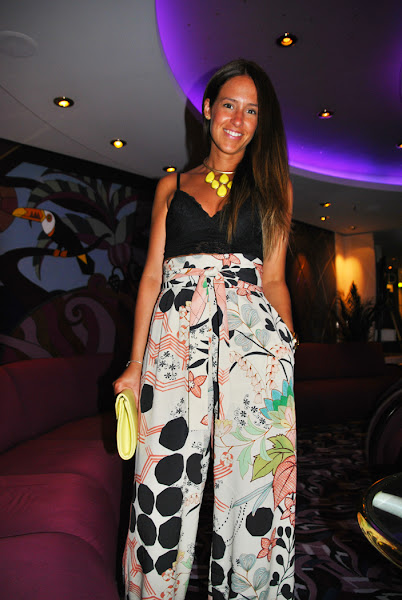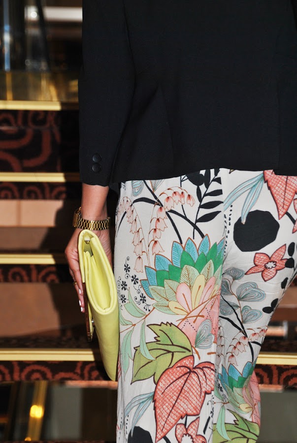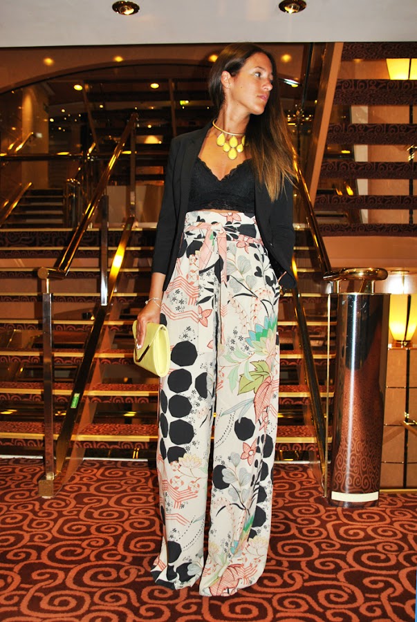 ¡Buenas tardes chic@s! Hoy os propongo un look con pantalones palazzo estampados combinados con crop top de encaje negro, que utilizo mucho y para diferentes ocasiones, y accesorios en color amarillo: un maxi collar y un clutch para darle un toque divertido. Un outfit perfecto para salir una noche a cenar con la familia o amigos, ahora que ya empieza a refrescar, por eso lo completé con una blazer negra de manga 3/4.