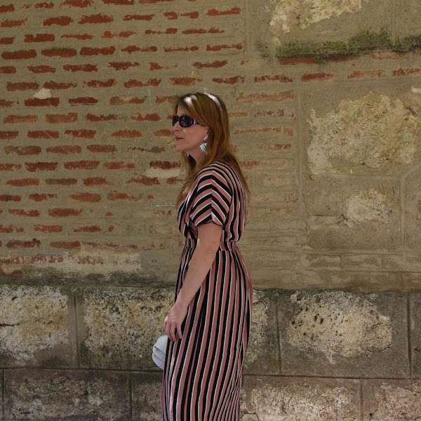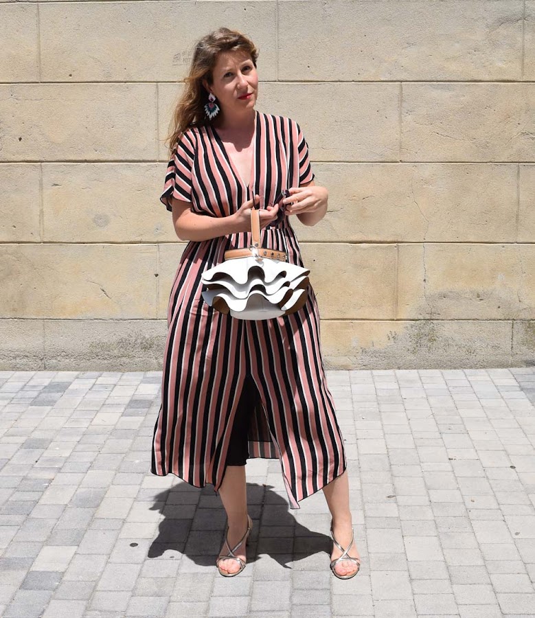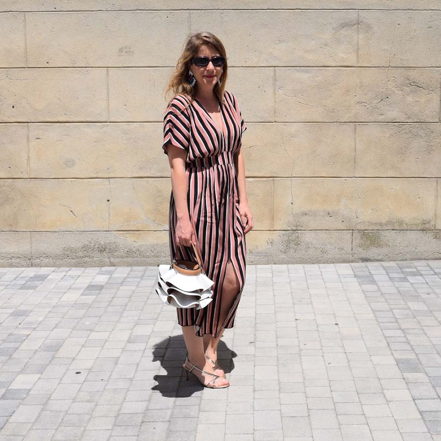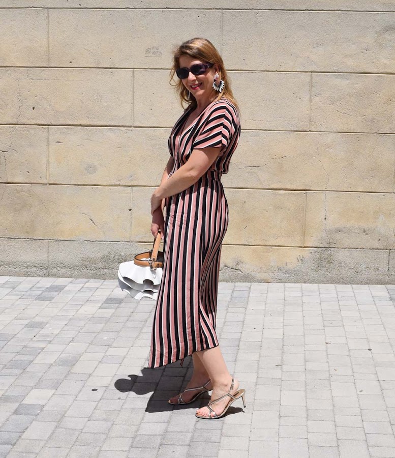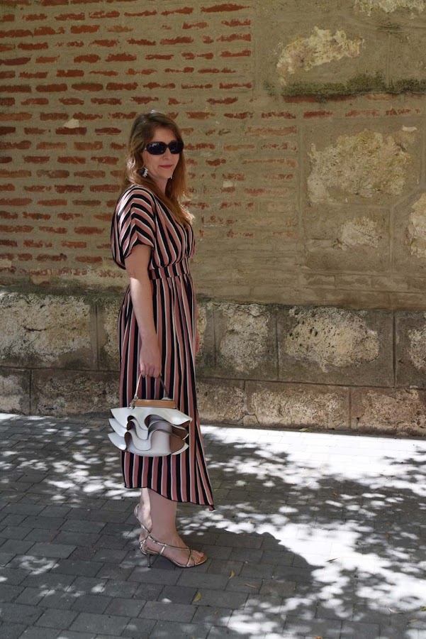 Para esta ocasión elegí este vestido rayado en tonos que van perfectos con los complementos.