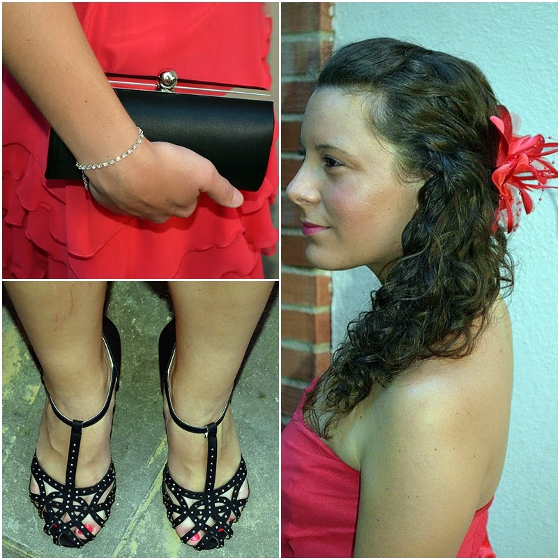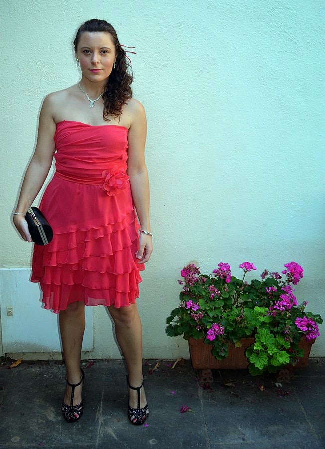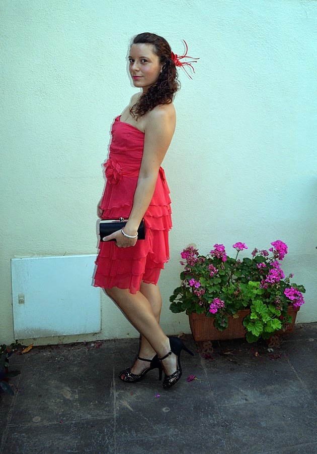 Holaaa! La semana pasada, concretamente el viernes, tuve que asistir a la presentación de mi prima como reina de las fiestas del pueblo. La ocasión lo merecía y teníamos que ir de gala. Yo elegí un vestido corto en tono rojo fresa (en las fotos no se aprecia, parece rojo vivo). El vestido es sencillo, de escote palabra de honor y con varias capas irregulares de volantes en la parte de la falda. Como complementos me puse mis cangrejeras negras y un clucth de mano que me regaló mi suegro hecho por él mismo (tiene una fábrica de bolsos :-) ) . Y para darle un poco más de armonía al look me recogí el pelo a un lado y me puse un tocado ¿Qué os pareció el look?