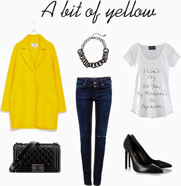 El look que hoy propongo tiene como pieza central un abrigo de color amarillo, tendencia total esta temporada, combinado con unos jeans, camiseta con mensaje y como complementos he optado por collar, zapatos y bolso en tono negro.