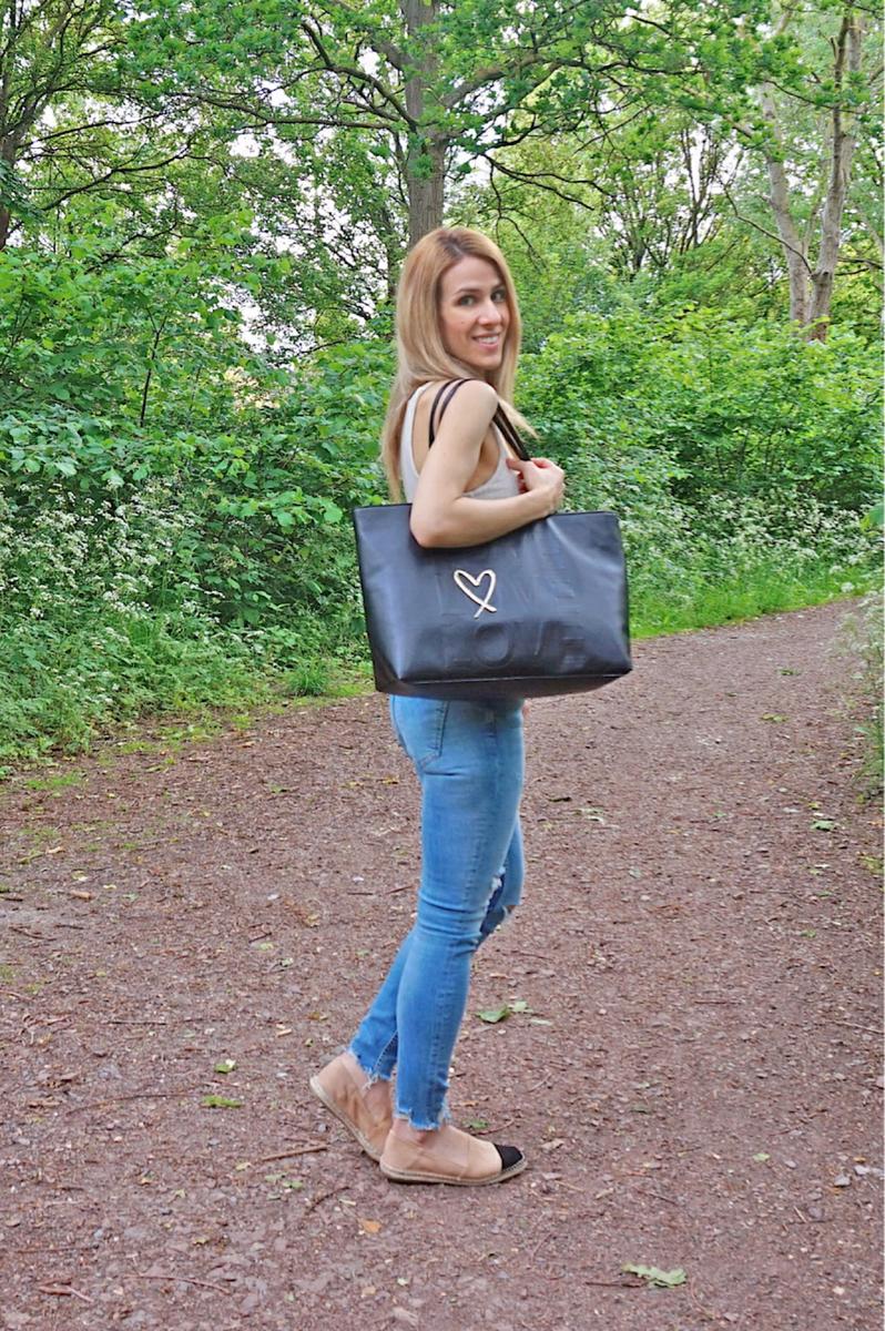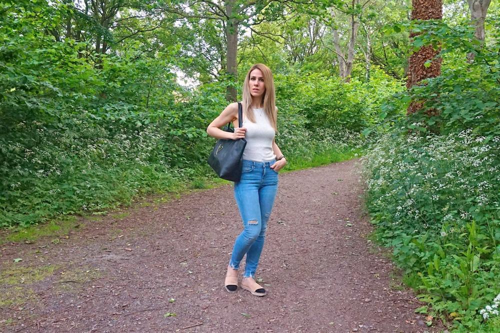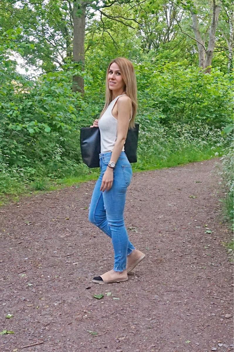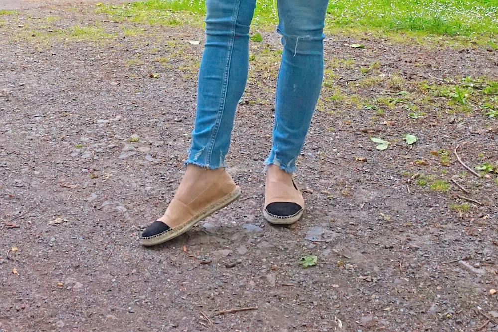 Para moverme por la campiña inglesa los looks con alpargatas se han convertido en mis favoritos (salvo cuando llueve, pero últimamente no ha llovido mucho). Estas que llevo son de Zara, y son súper cómodas porque son planas y sujetan muy bien el pie. Como son de colores neutros, nude y negro, van con todo en el armario.