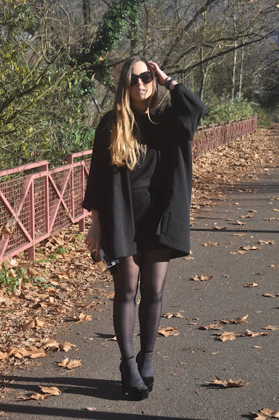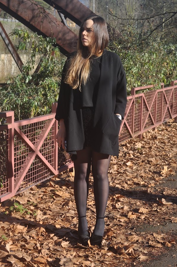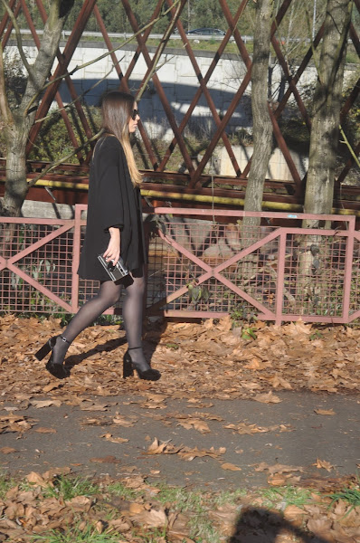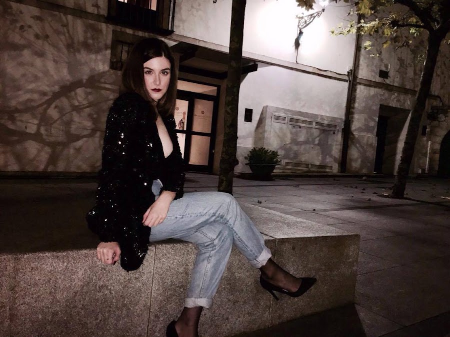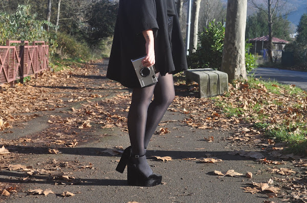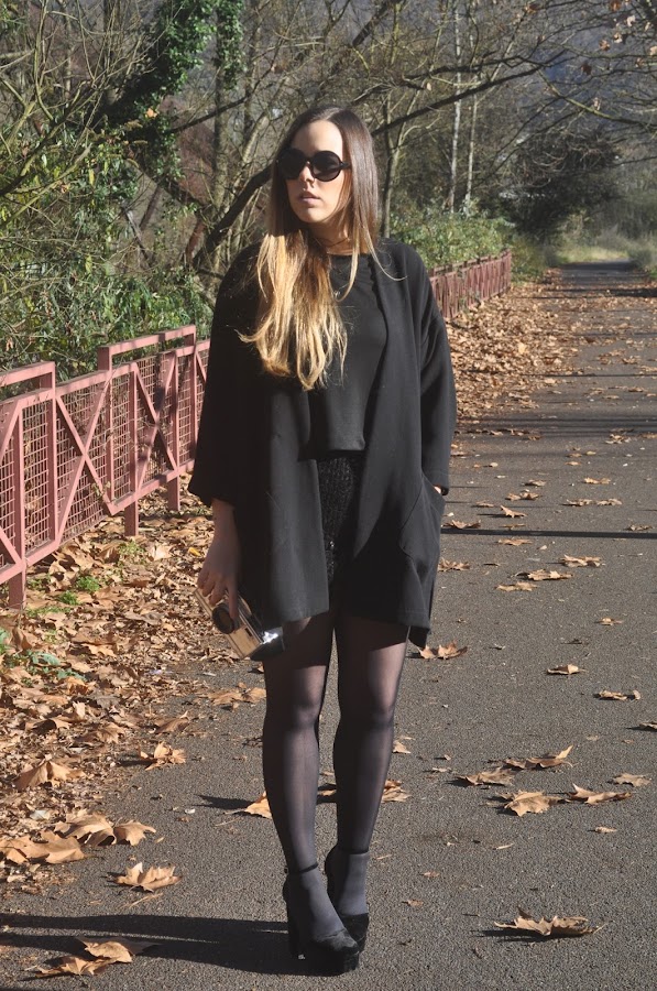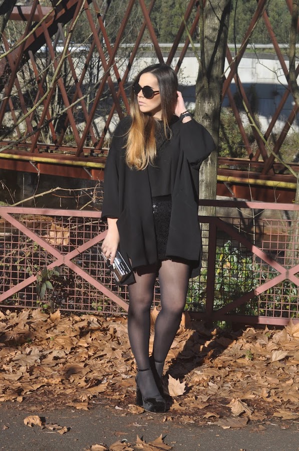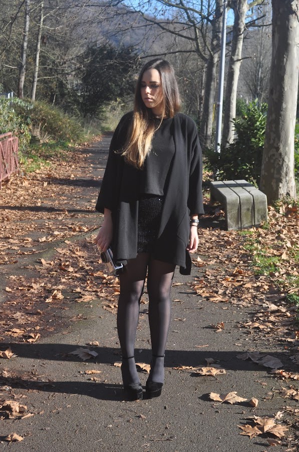 Mi primera propuesta es un total black compuesto, en su totalidad, por básicos de armario. Crop top, falda negra de pailettes de terciopelo (esta no es un básico, pero como si lo fuera hahaha), chaqueta oversize y zapatos negros (estos son mi última adquisición). Y para terminar y romper con la monotonía del negro, clutch plateado en forma de cámara de fotos (me tiene loca).