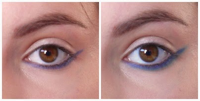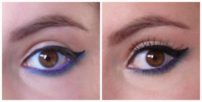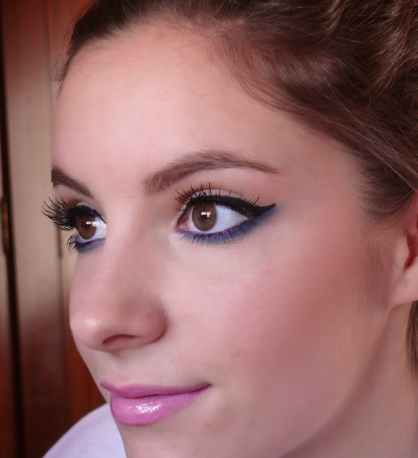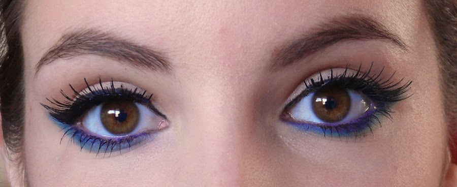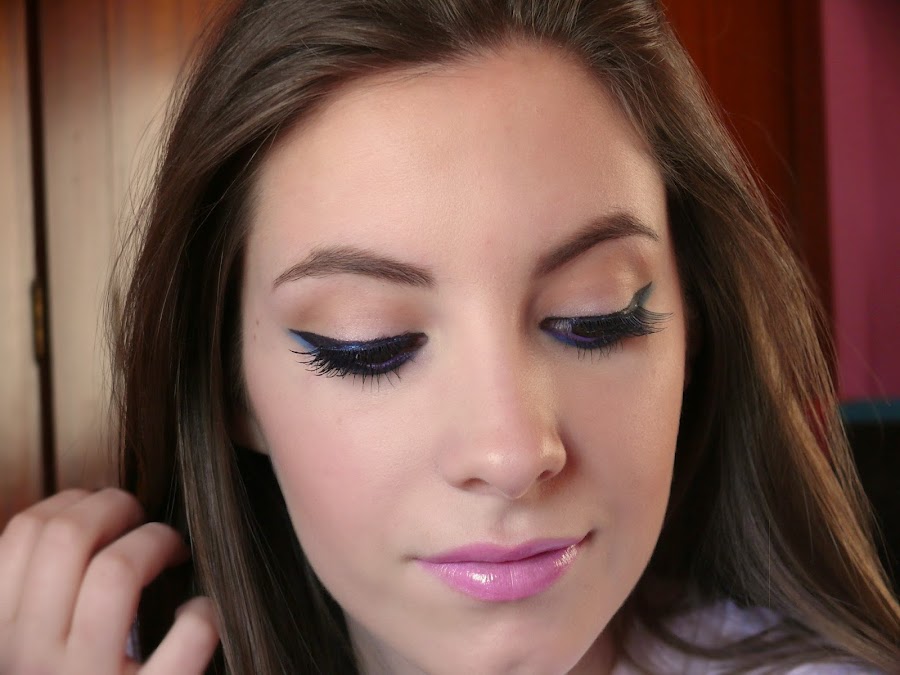 Por último, en la linea de agua ponemos un lápiz de color moradito. Delineamos el ojo y aplicamos mucha mascara de pestañas. En este caso he optado por unas pestañas postizas, para dramatizar un poco más la mirada.