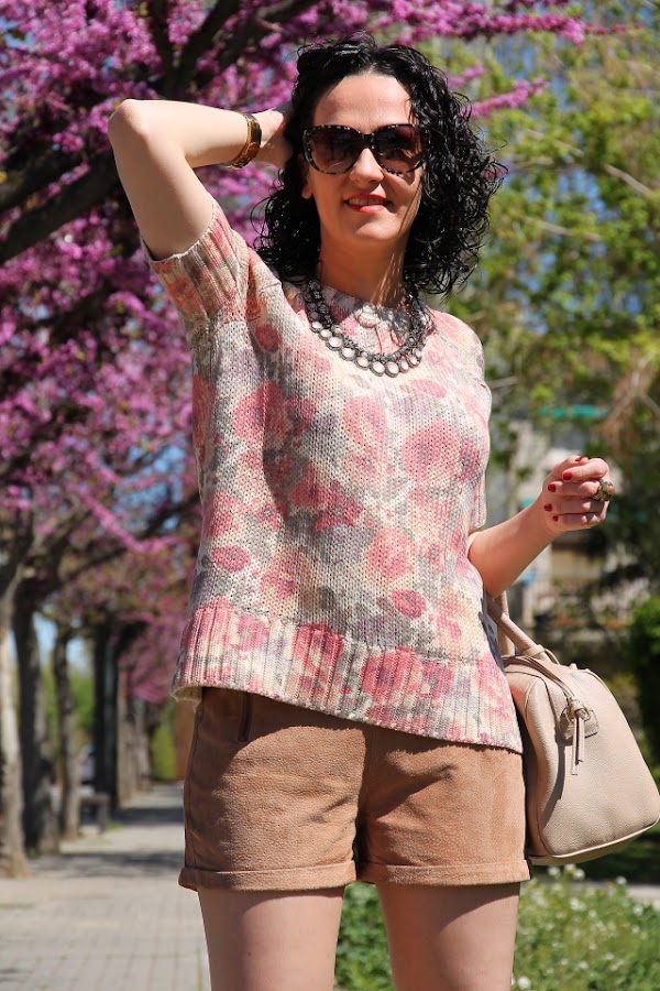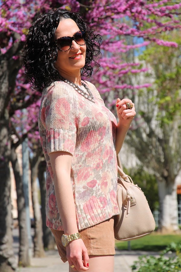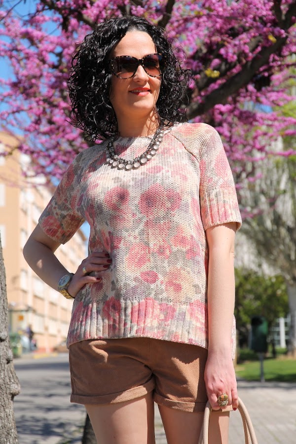 Este finde poniendo orden en las carpetas de mi portatil aparecieron estas fotos de las que ya ni me acordaba. Como veis por los árboles florecidos pertenecen a principios de la primavera, es más, recuerdo que era domingo. La razón de que me acuerde tan bien es por el calor que pasé, salimos con mi marido a vermutear y las temperaturas eran más propias del verano que de primavera. Por eso me decanté por ponerme un jersey de hilo con estampado floral de manga corta y shorts camel de piel.