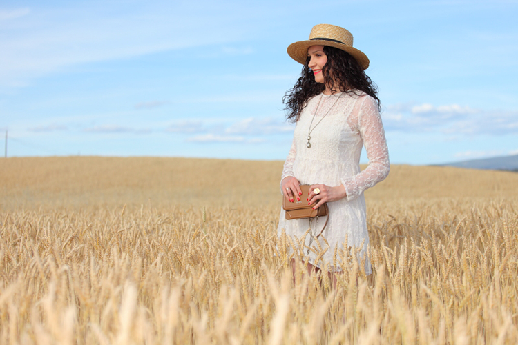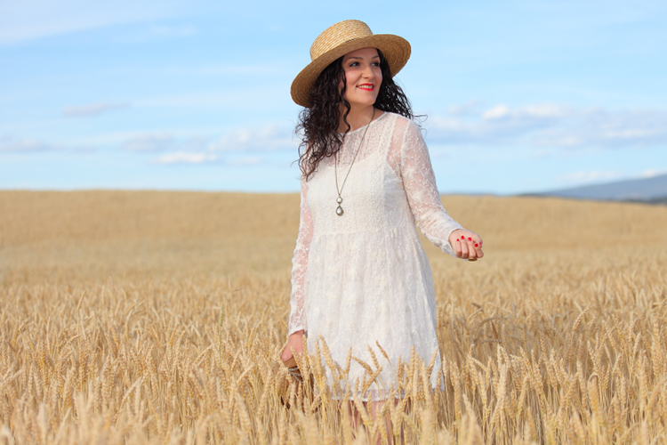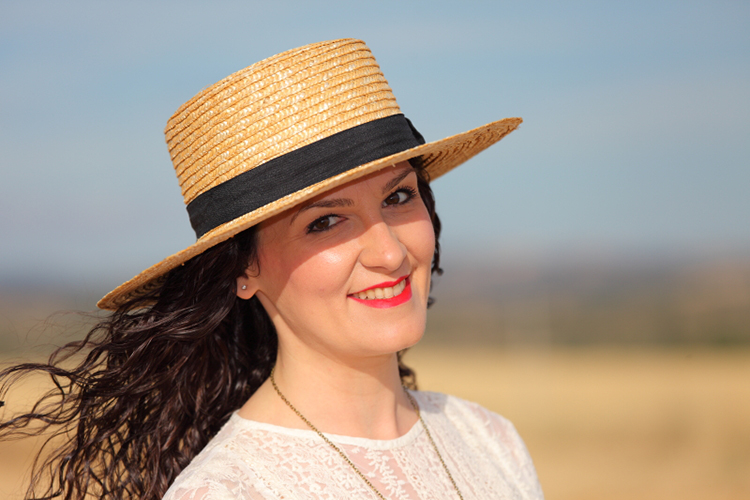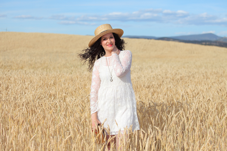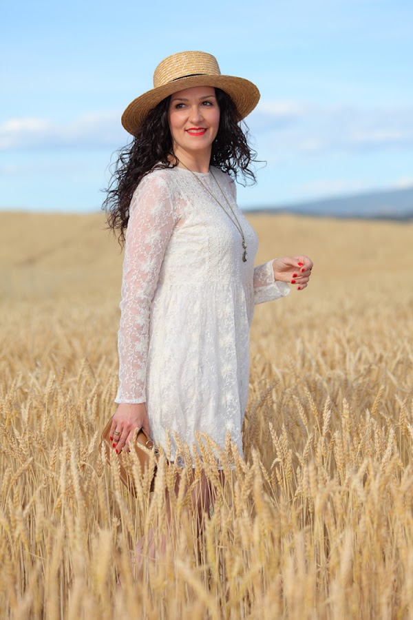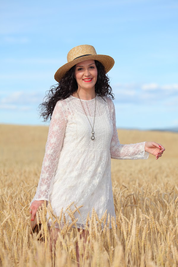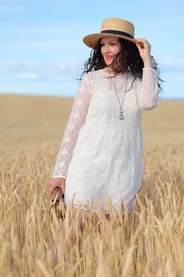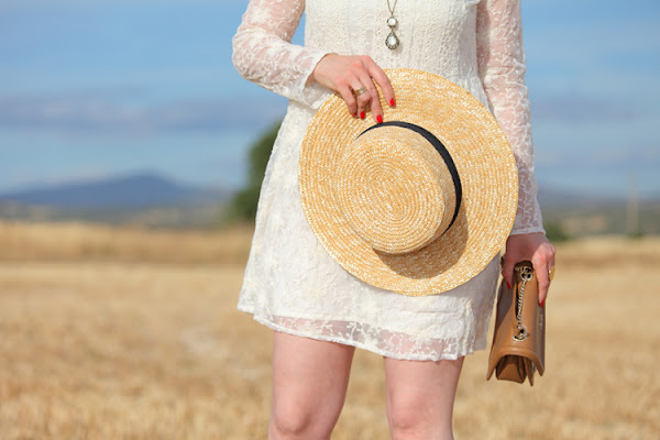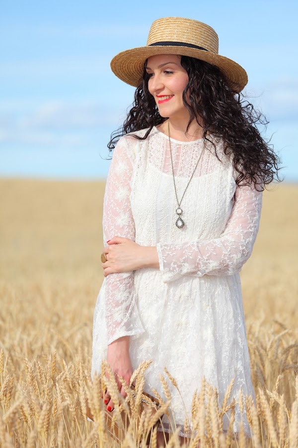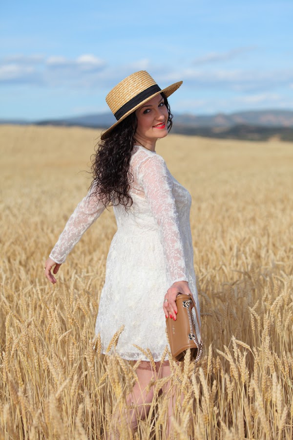 Las fotos de hoy ya entran a formar parte de mis preferidas desde que tengo el blog. Con un precioso vestido de encaje acompañado de un canotier, una puesta de sol idílica y un campo de trigo, tenemos como resultado un look romántico que parecía predestinado para unirse y regalarnos unas fotos tan bonitas.