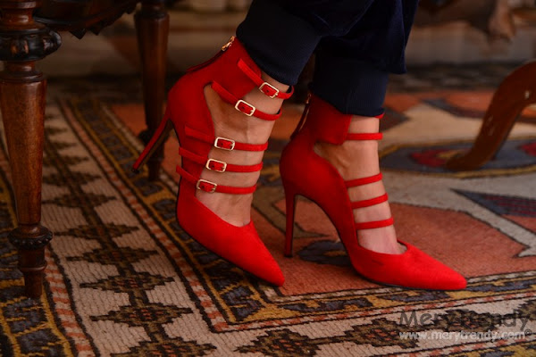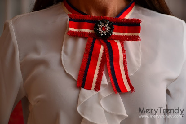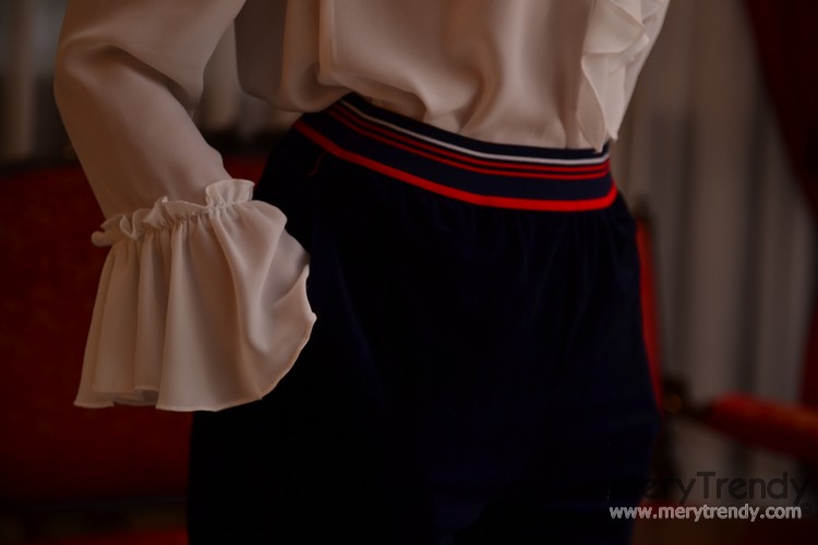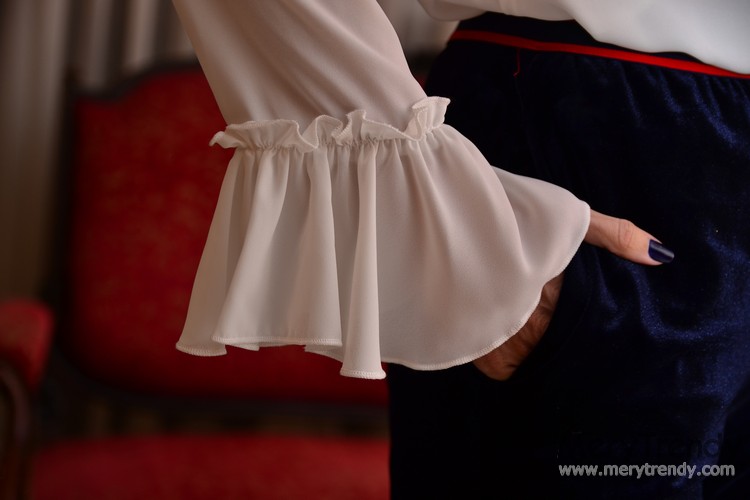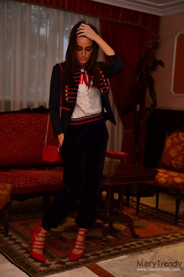 En esta ocasión, me lo he llevado a mi terreno, conjuntando una blusa de volantes con lazada al cuello (de quita y pon) con un pantalón chandalero de terciopelo en azul marino con franjas rojas en la cinturilla del mismo porque, a mi juicio, creo que el juego de contrastes entre lo romántico y delicado con lo sport resulta de lo más apetecible, ¿no os parece?