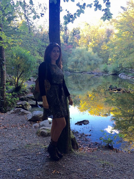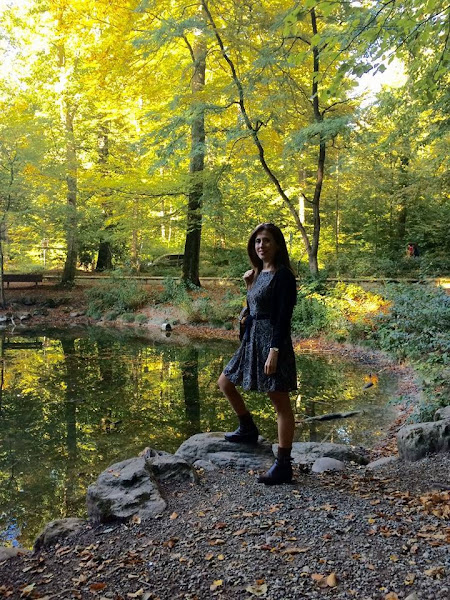 Hoy me pierdo en uno de esos parajes bucólicos y llevo un vestido con estampado floral, chaqueta de punto corta y botines.