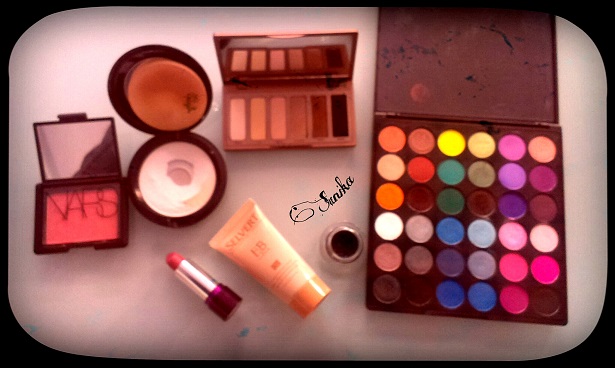 Para el look de los ojos usé la Smokeypalette de Coastal Scents. Exactamente los 3 primeros colores de la segunda columna empezando por la derecha. Para difuminar los cortes usé los tonos intermedios de la Naked Basic el WOS y el Naked 2.Para iluminar bajo la ceja usé el Venus. Para delinear los ojos utilicé el fluidline de Mac y como máscara de pestañas mi favorita, False Lash Effect de Max Factor.