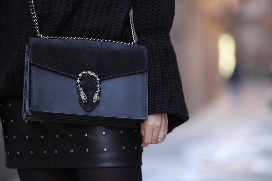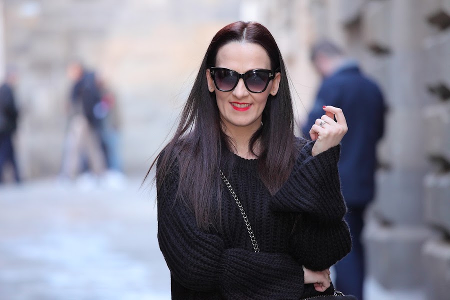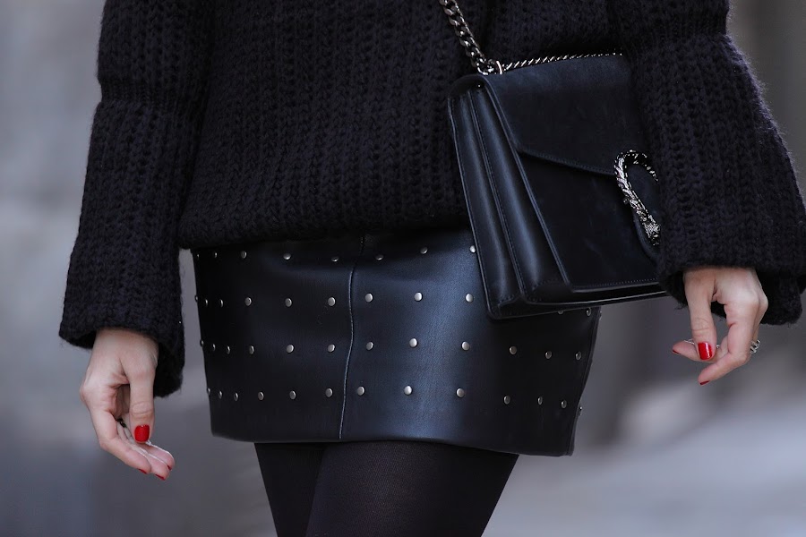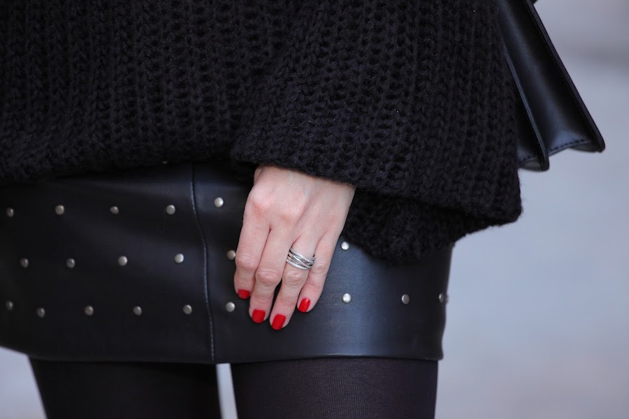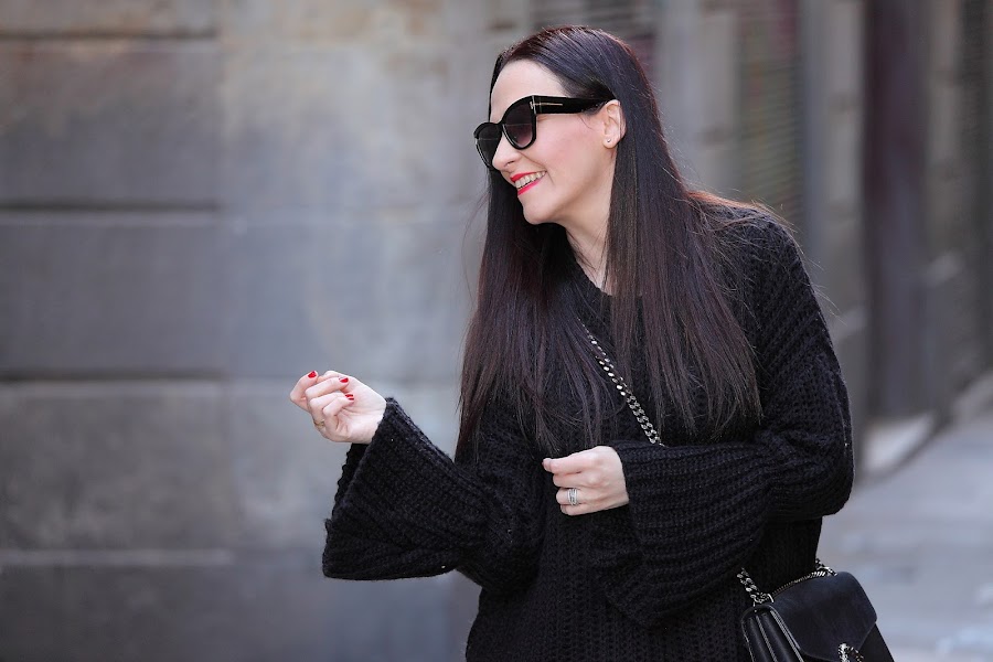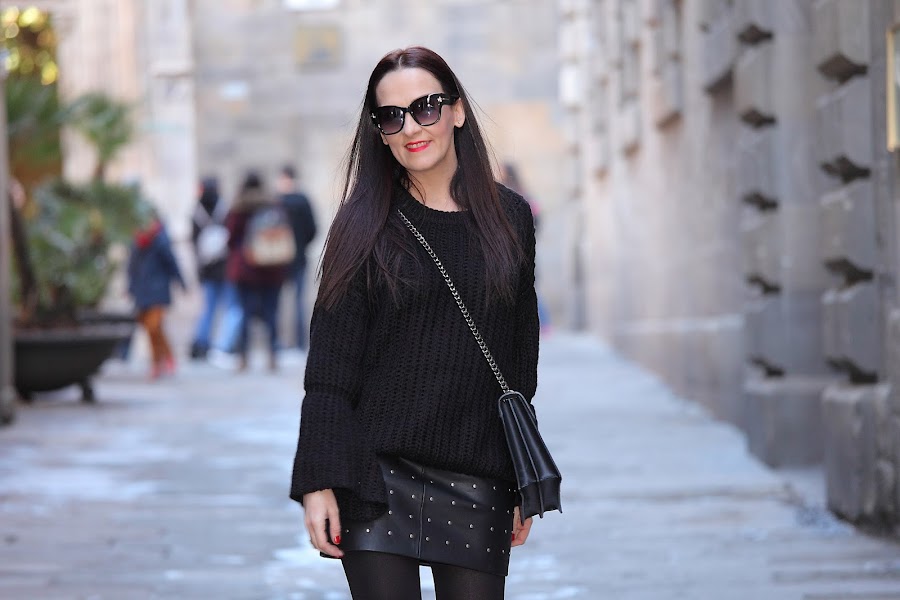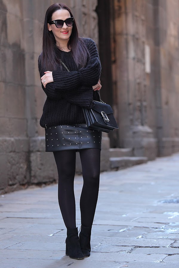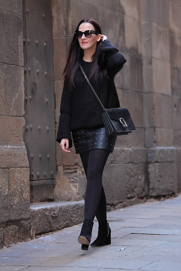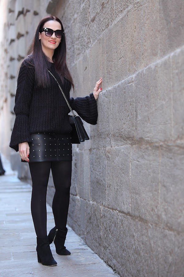 Me encanta Barcelona, siempre que puedo me escapo aunque sean uno o dos días para disfrutar de la ciudad. Así que hace unos días, como tenía vacaciones, aproveché para pasar un par de días allí y luego otro tanto en Andorra. Estos días me supieron a gloria, pasear relajadamente viendo el mar, buenos ratos de shopping, probar restaurantes nuevos, tocar la nieve, relax en el spa de Caldea..., vamos lo mejor para descansar y cargar pilas. El look de hoy es el que llevé el día que llegamos a Barcelona. De nuevo un total black con un jersey con mangas de campana y falda de polipiel con tachuelas.