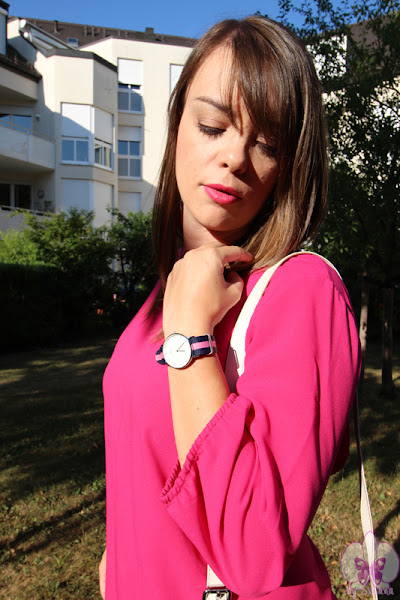 Además, también estreno mi nuevo reloj de Daniel Wellington, que estoy emocionada con él, le veo elegante y a la vez, este que he elegido yo, bastante informal por su correa de tela y los colores, en azul marino y rosa, ¡me parece perfecto!.