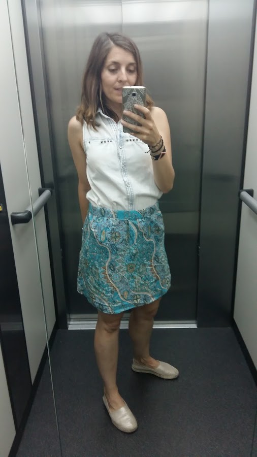 Falda hecha a partir de un vestido que me trajo Rubén de su viaje a Malasia. Me quedaba grande, así que lo he reconvertido en una falda y un top, aprovechando el curso de costura.