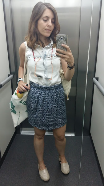 Camisa de Primark de hace tres temporadas y falda de Venca del verano pasado, no recuerdo el precio exacto, pero no serían más de 12 o 15€. La usé muchísimo en otoño.