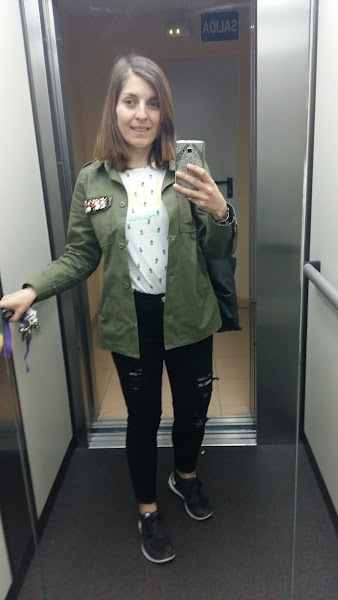 La cazadora de la que os hablé en abril, los vaqueros de Stradivarius y una camiseta con estampado de piñas monisima que me compré en Hipercor, en la sección de niñas. Creo que me costó 12€.