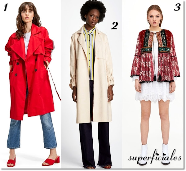 1. Trench rojo con rayas laterales de Stradivarius, 39,99 € - 2. Trench de Zara efecto ante 29,95 € - 3. Chaqueta corta con volumen y abalorios de Zara 49,95 €