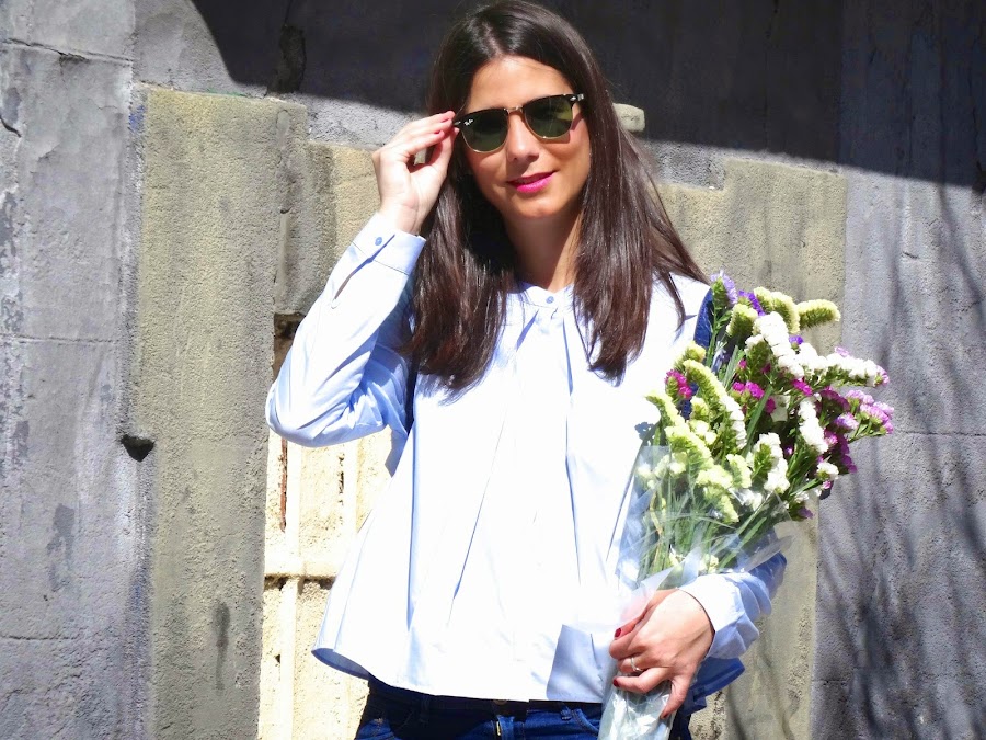 En este look he combinado unos jeans, prenda estrella de cualquier época del año, con una camisa azul bebé con un diseño muy original y una americana azul marino con pajaritos. En los pies estas mosqueteras de ante marrón que creo (y espero) que no vuelvan a ver la luz hasta el invierno que viene.