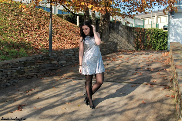 En el tercero look llevo vestido de lentejuelas plateado de sisas que se adapta al cuerpo con stilettos negros.
