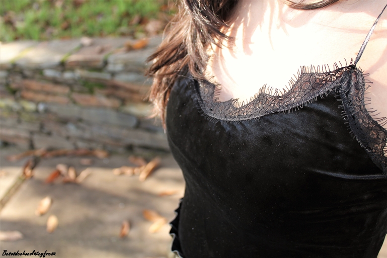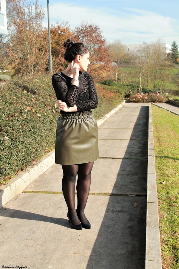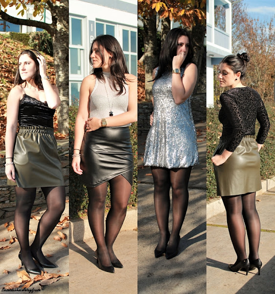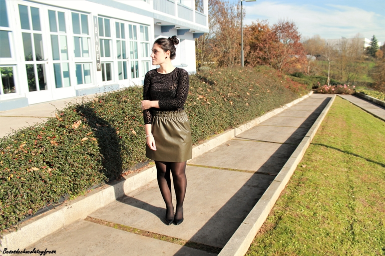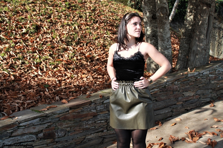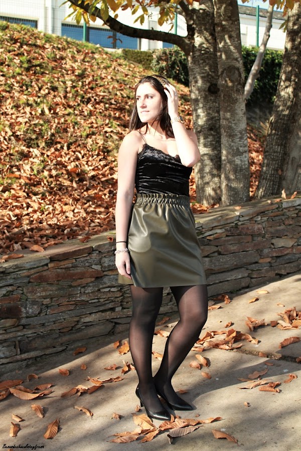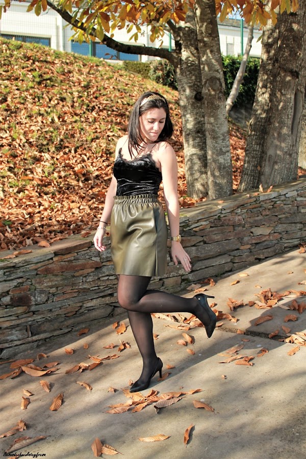 El primero look lo compone una falda en polipiel verde, con frunde en la cintura y bolsillos laterales con body lencero y de terciopelo negro. Completo el look con stilettos y diadema dorada de hojas al pelo.