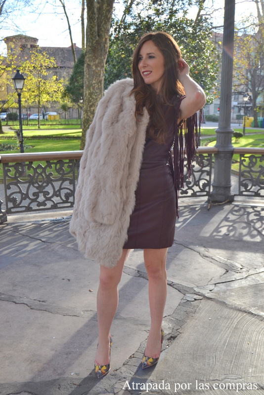 VESTIDO DE CUERO: y a quemar la noche..... En este caso un vestido de cuero con escote en la espalda y flecos, un look atrevido y rompedor, este look lo escogí para una noche de chicas