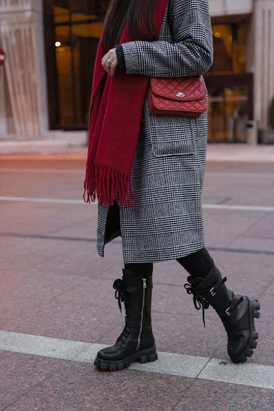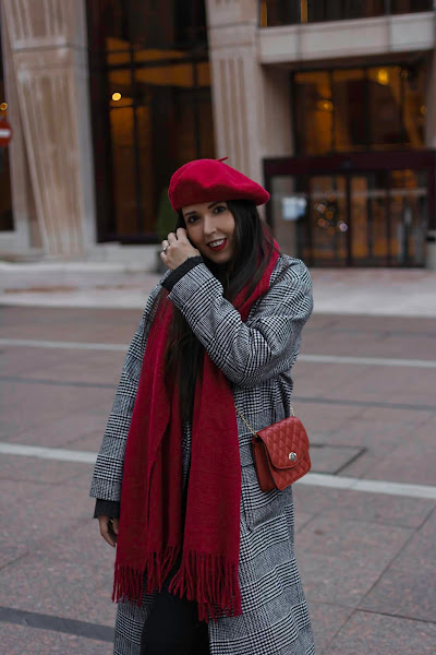 Sí que tengo algunos looks que aunque he puesto en Instagram, no me ha dado tiempo de compartir por aquí y prometo que en estas próximas semanas os enseñaré con más detalle. El de hoy es un outfit que tenía muchas ganas de crear que lo que hice fue salir, hacer las fotos y volverme a casa. En estos días andar por la calle es un poco caos y prefiero huir todo lo que puedo de las aglomeraciones. Volviendo al look, es bastante casual y cómodo con un toque navideño por el color rojo. Todo son prendas de otras temporadas menos la bufanda y la boina que fue un regalo de mis papis hace unos días, tenía muchas ganas de algo así. El abrigo es de corte oversize en cuadros y combina genial con el vaquero negro y el jersey también en el mismo color. Las botas track que ya me habéis visto por aquí y un bolso que compré cuando vivía en Valencia y que realmente es una riñonera. Como quería un bolso para el look en color rojo, decidí quitarle el cinturón para añadirle una cadena y poder llevarlo cruzado. ¿Os gusta la idea?