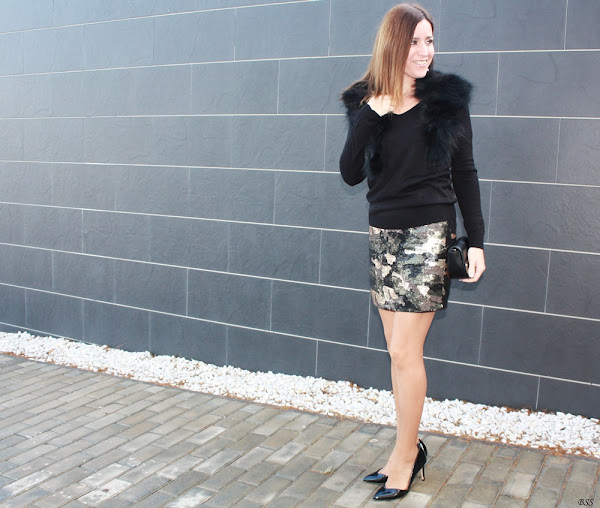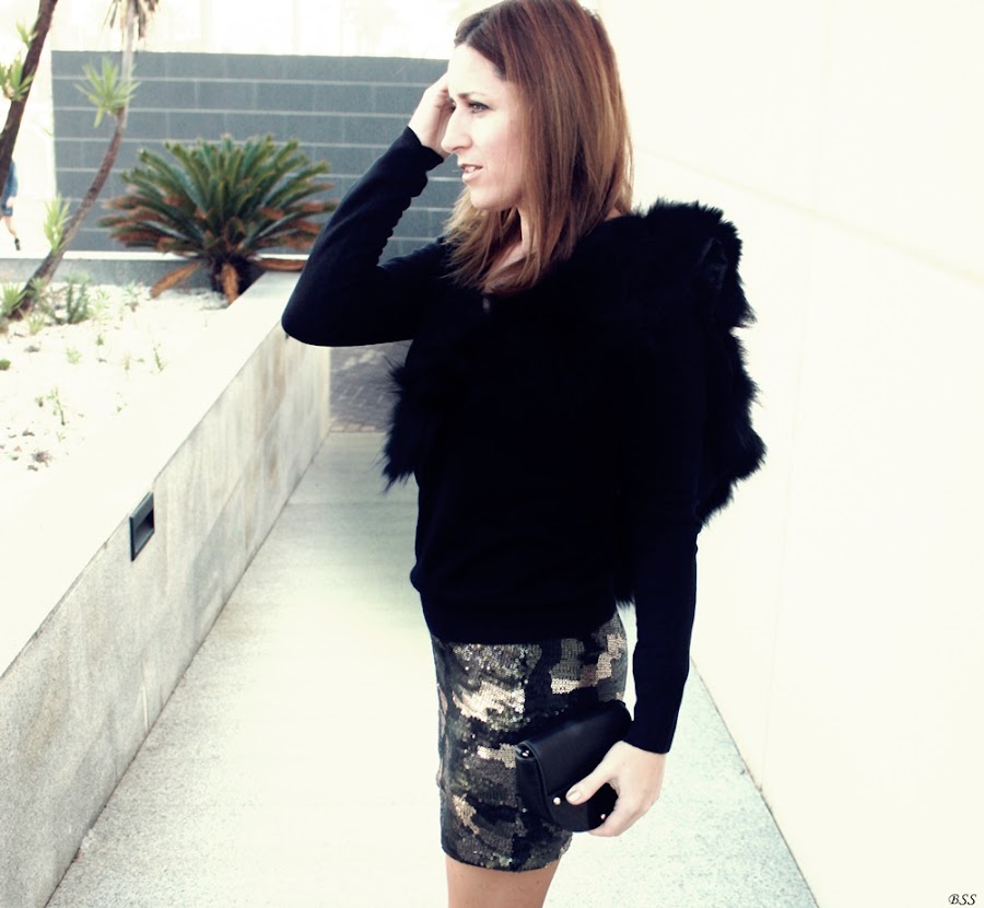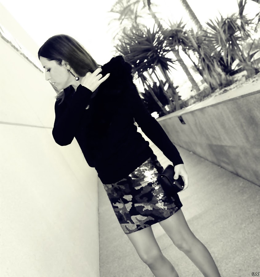 En este caso elegí una falda de paillettesdonde el juego de colores y la forma del dibujo hace un guiño a los estampados camuflaje tan en tendencia.