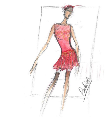 Boceto para el diseño de Lorenzo Caprile Segunda parte "Rubíes", los rubíes, refleja la America enérgica la era del jazz. Para esta parte Balanchine eligió la música de de Igor Stravinsky.