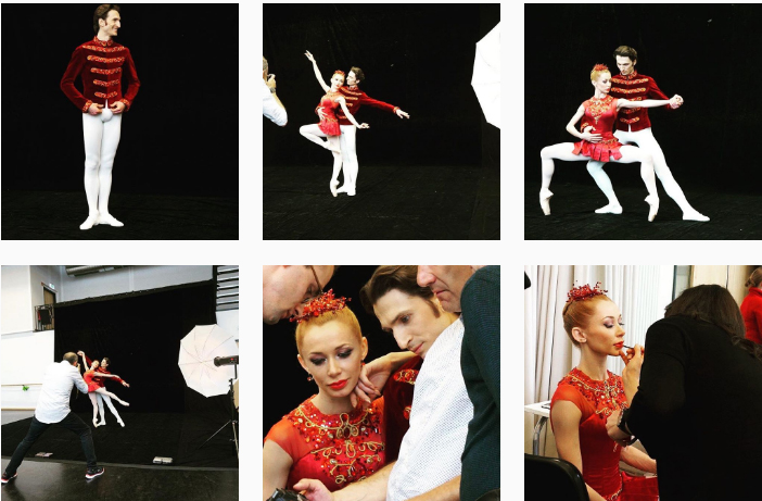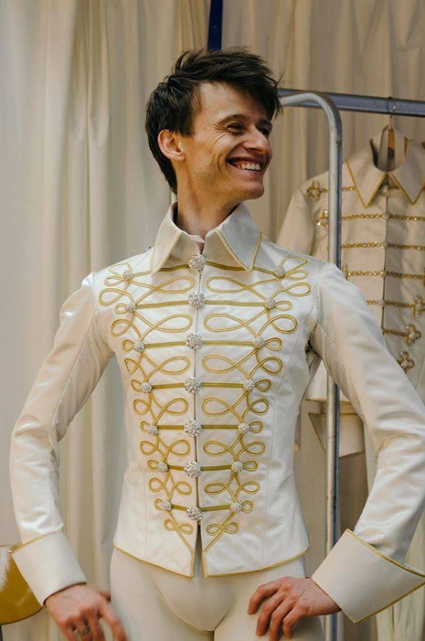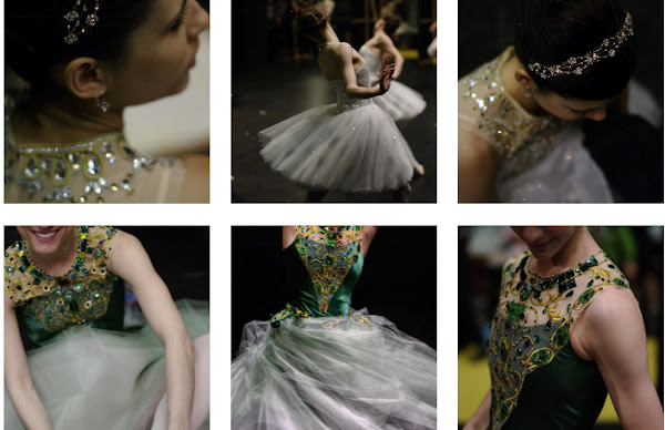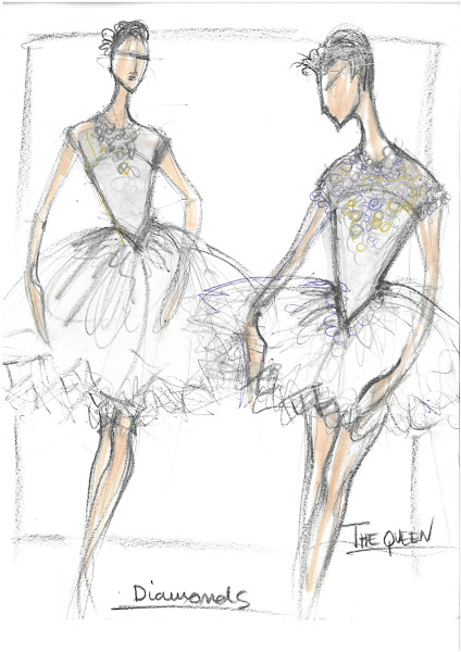 Podéis ver la riqueza de los trajes que seguro lucirán los bailarines como preciosas joyas en el escenario. Para su confección Caprile ha elegido materiales como el terciopelo y raso adaptando los patronajes a los movimientos de los bailarines, los colores representan las tres joyas el rojo rubí y el verde esmeralda, y para el bordado de los brillantes un blanco marfil.