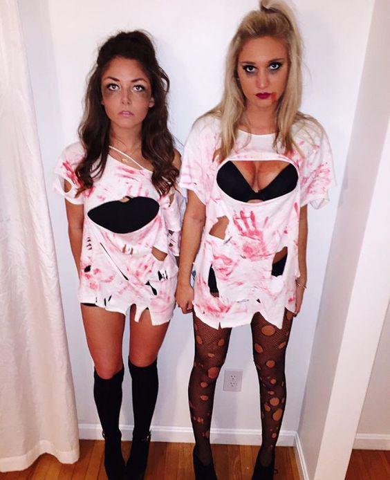 Solo necesitarás medias negras, camiseta blanca larga, pintura roja, tijeras y maquillaje.