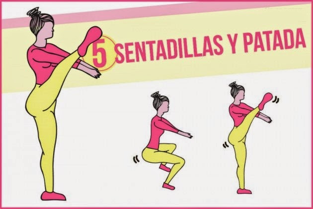 Para este ejercicio, haz una sentadilla como en el ejercicio anterior, y al subir haz la patada que hay en la imagen. Luego otra vez sentadilla y otra vez sube y patada.