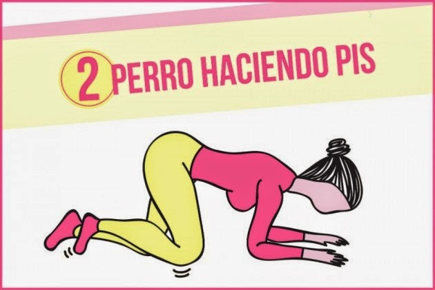Como en el anterior ejercicio ponte de gatas como en la imagen, y luego levanta una pierna hacia el lado, como los perros cuando hacen pis, hasta que la parte interna de la pierna quede paralela al suelo. Repite esto de nuevo unas 15 veces y cambia la pierna.