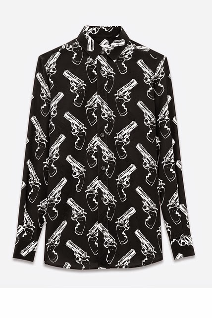SAINT LAURENT vs MANGO ¿y que os parecen las ilustraciones de pistolas? La camisa con estampado de pistolas de Saint Laurent es una monada. Cuesta 850 euros. En mango puedes encontrar un estampado muy parecido por 29,99 euros.