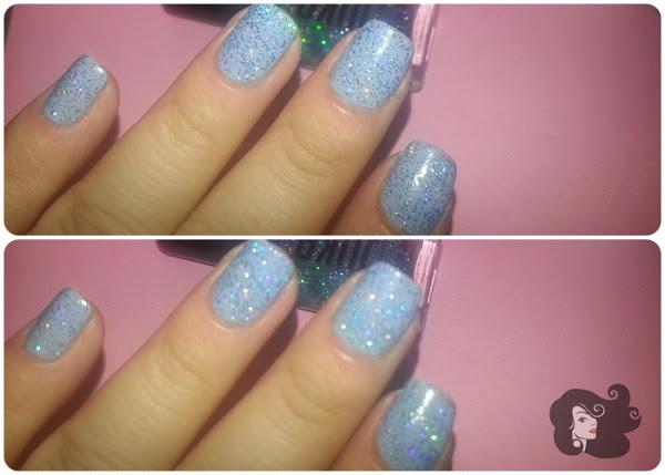 Este glitter es precioso sobre bases azules, celestes y hasta me animo a decirles sobre bases violetas, es un glitter relativamente fino y muy brillante, en las fotos lo van a ver aplicado en una capa sobre base gris azulada .